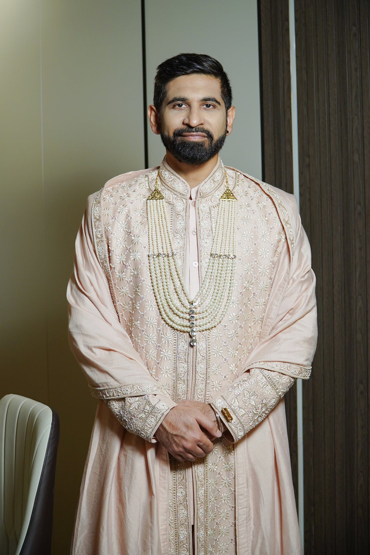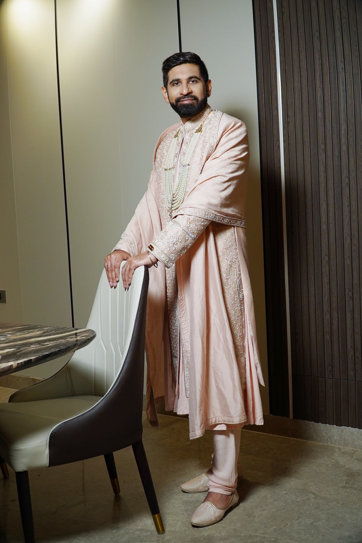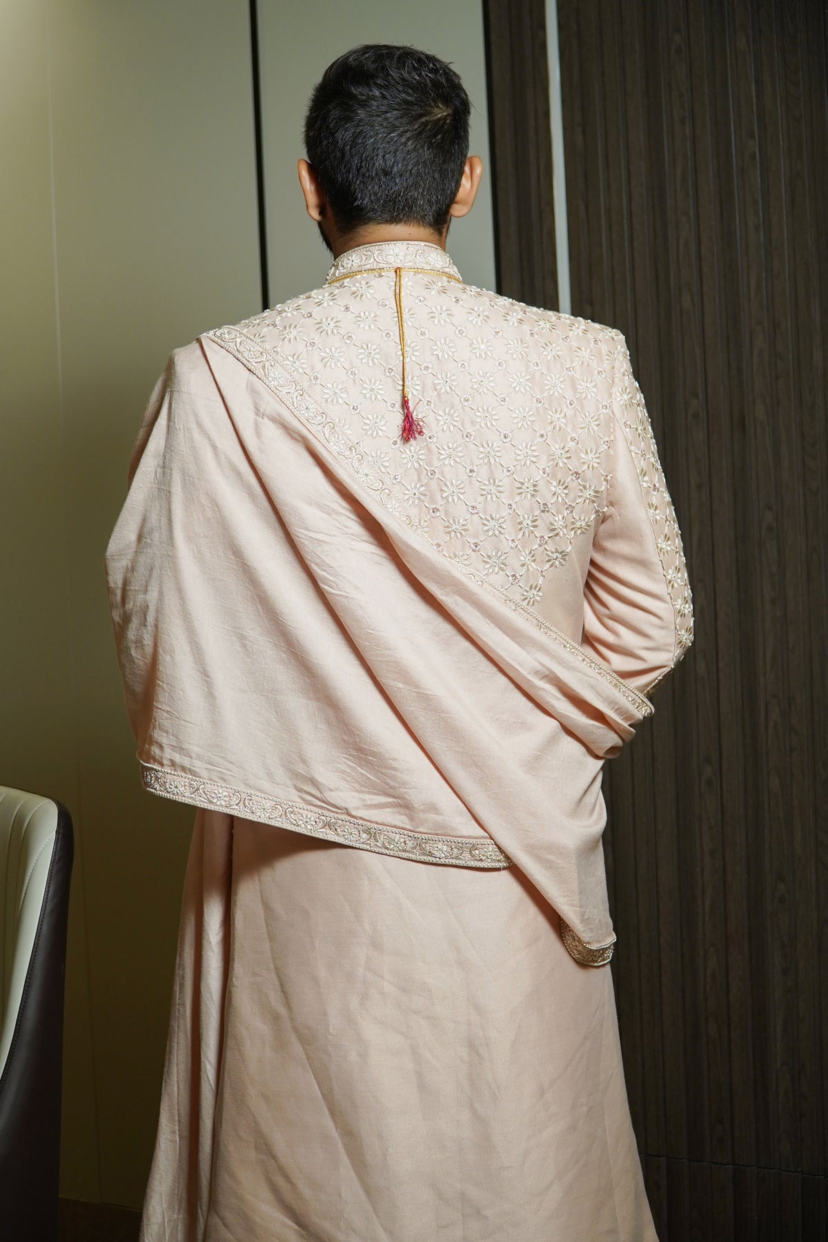 Featuring A Baby Pink Coloured Lucknowi Sherwani Paired With A Matching Stole
