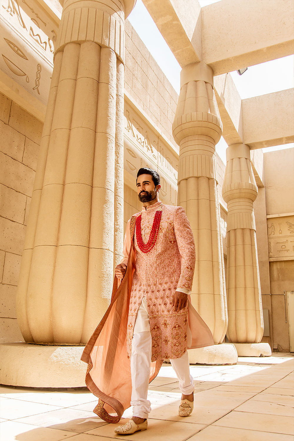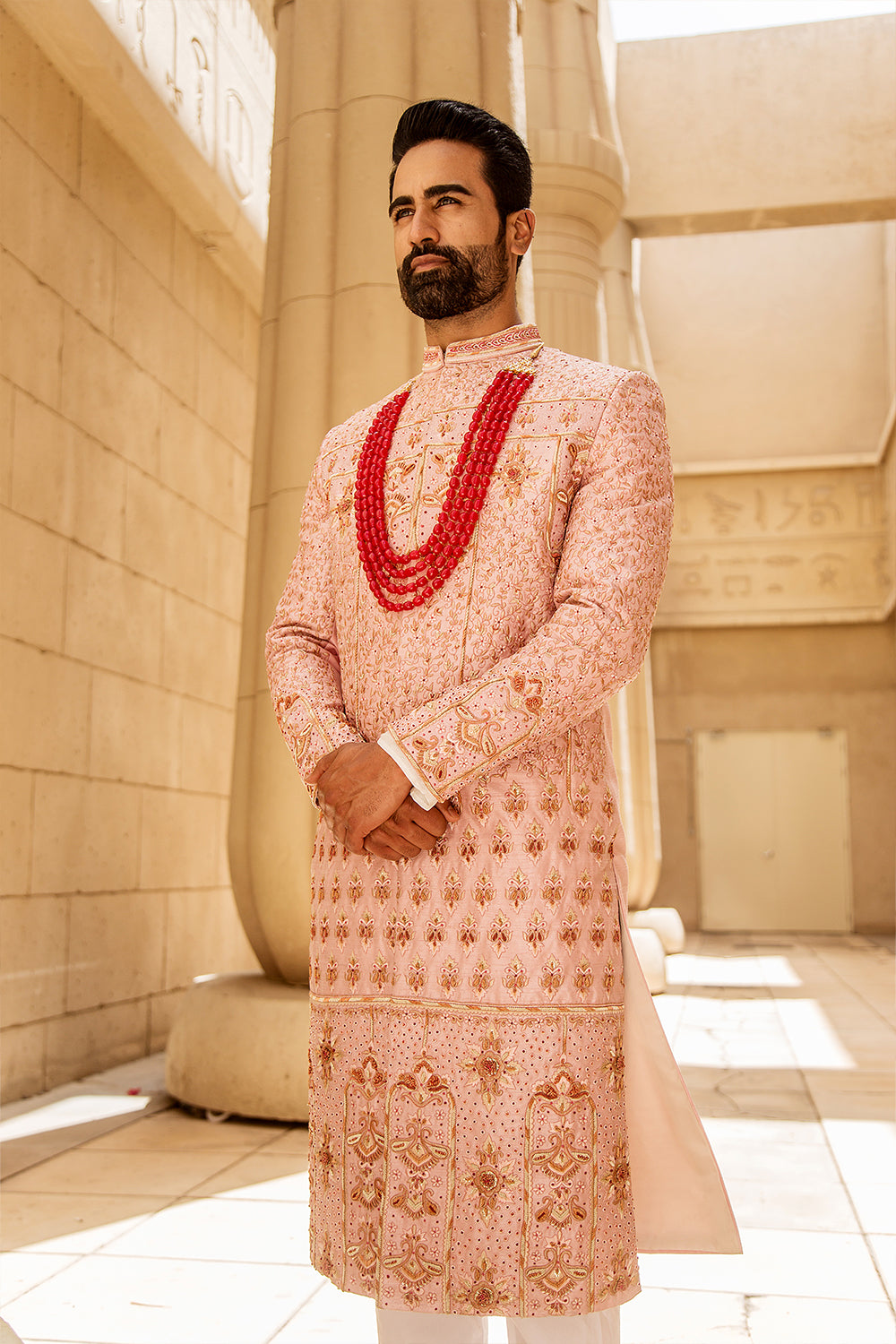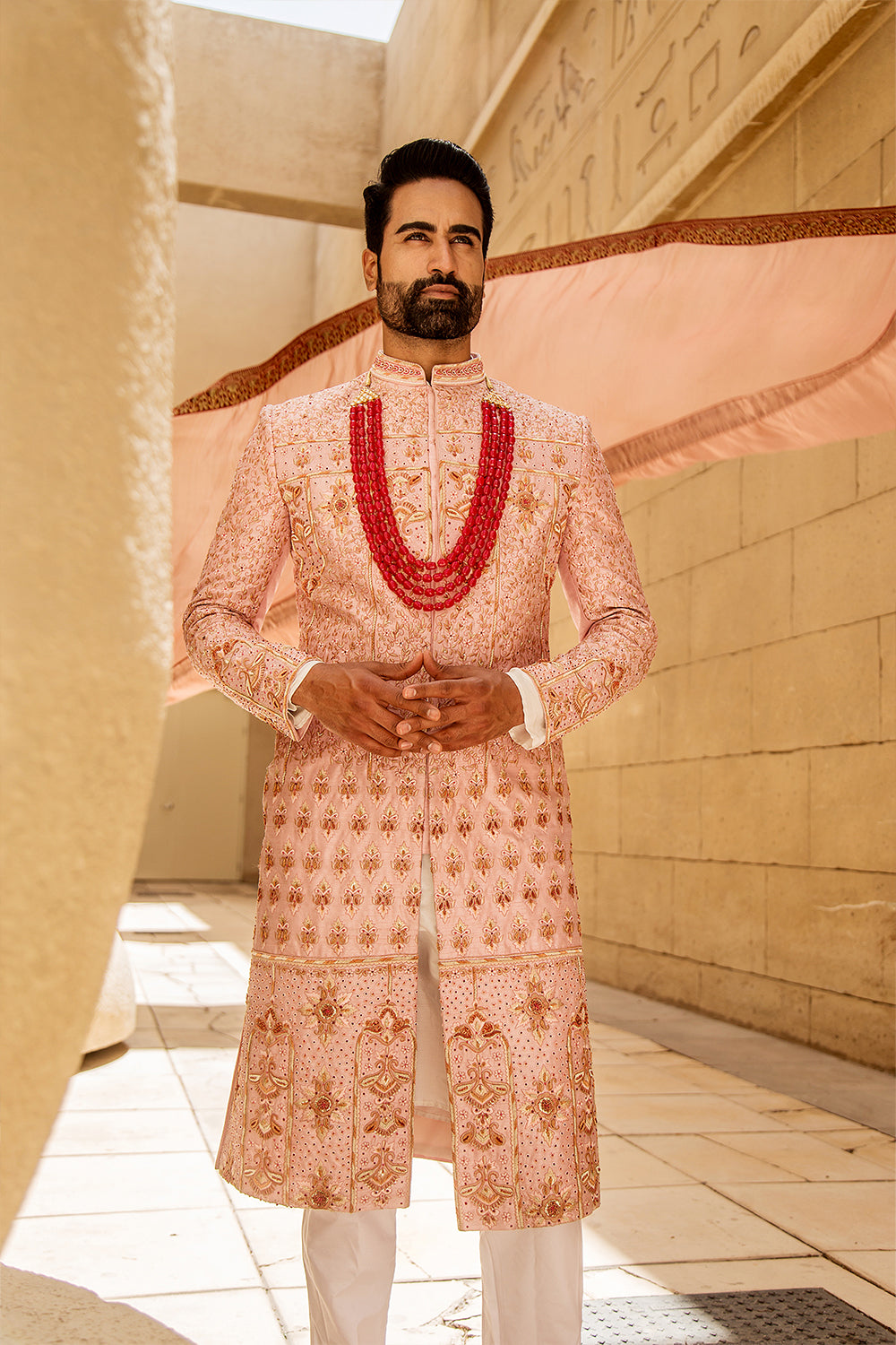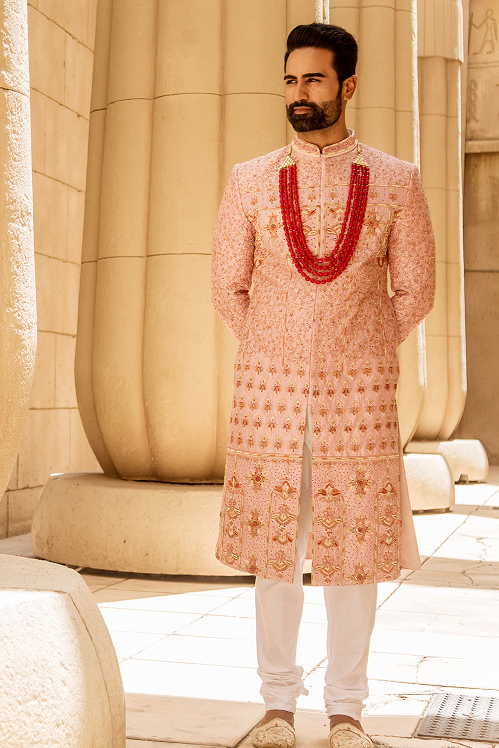 Featuring A Pink Sherwani In Raw Silk Base Zardosi Embroidery. It Is Paired With A Contrasting Mustard Stole, Mala, Kurta, Safa, And Off White Churidar Pants.
